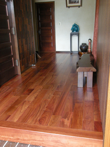 ▲ケンパスチークや花梨より硬く、耐久性にすぐれた樹種で、床材に適しています。乾燥後の狂いも少ない樹種です。鉄道の枕木に使われていた材です。赤基調の色合いで美しい木目、カリンの代用品として紹介される場合もありますが色合いは赤基調でほぼ均一のカリンより薄めの色合い。コーディネイトし易い樹種でもあります。