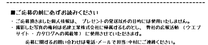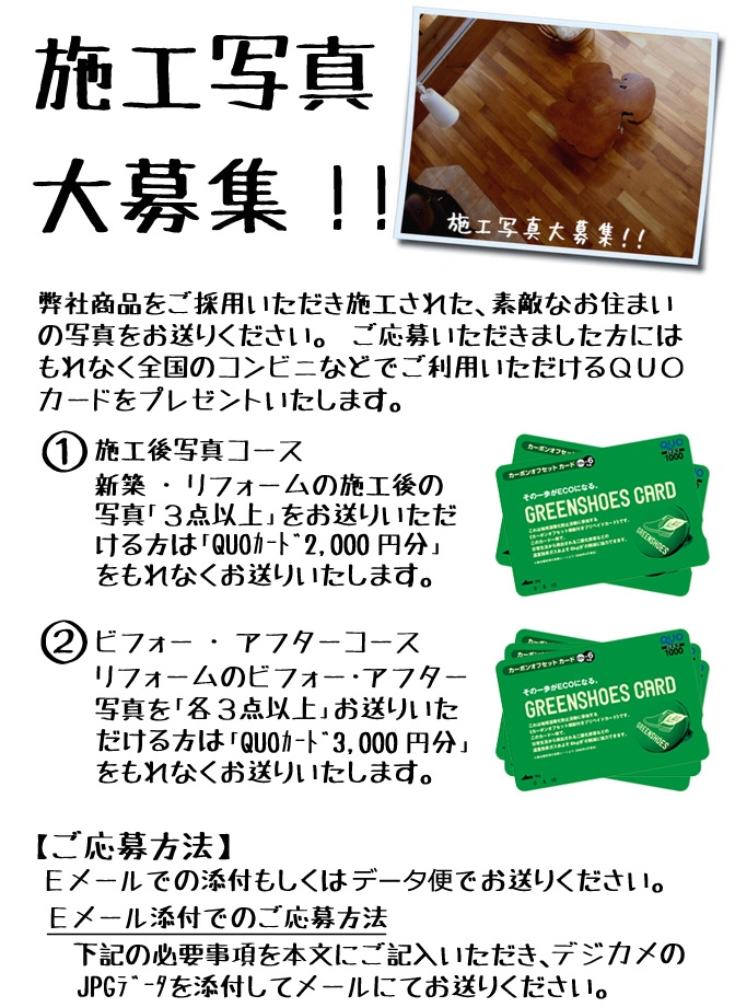 ・・・・・・・必須事項 応募コース:施工後写真orビフォー・アフター ご採用頂いた商品名: 氏名: 郵便番号:〒 住所: 電話番号: ・・・・・・・よろしければお知らせください。 現場名等: 商品についてのご感想など: ※写真も忘れずに添付を宜しくおねがいします。