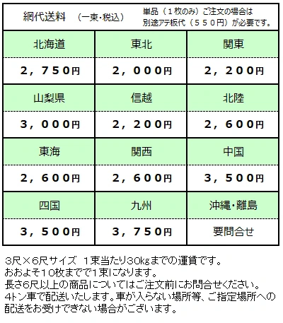 運送会社は第一貨物で秋田県より発送となります。日曜、祝日の配送はお受けできません。 製造工場より直送いたしますので代引き発送は不可となります。 単品(1枚)のご注文の場合はアテ板が必要になります。アテ板代(550円)も合わせてお支払い願います。