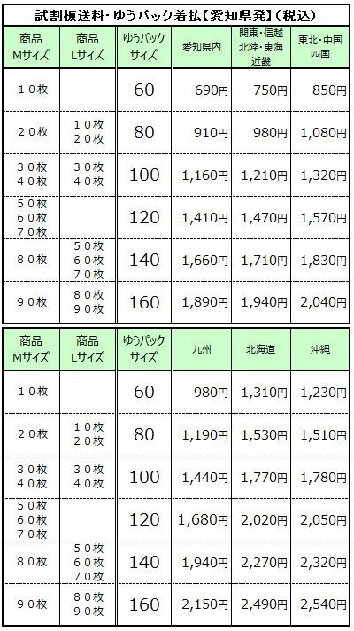 試割板送料・地域区分 試割板送料表