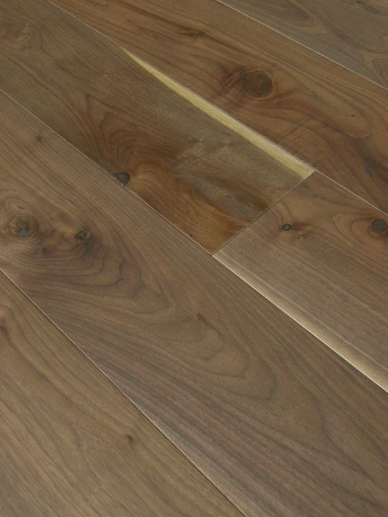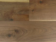 幅150mm、長さ1818mm、表面単板3ミリのアメリカンブラックウォールナット一枚板(挽板)貼り三層複合フローリング。Nグレード節有タイプ自然塗料(オスモ)塗装品。